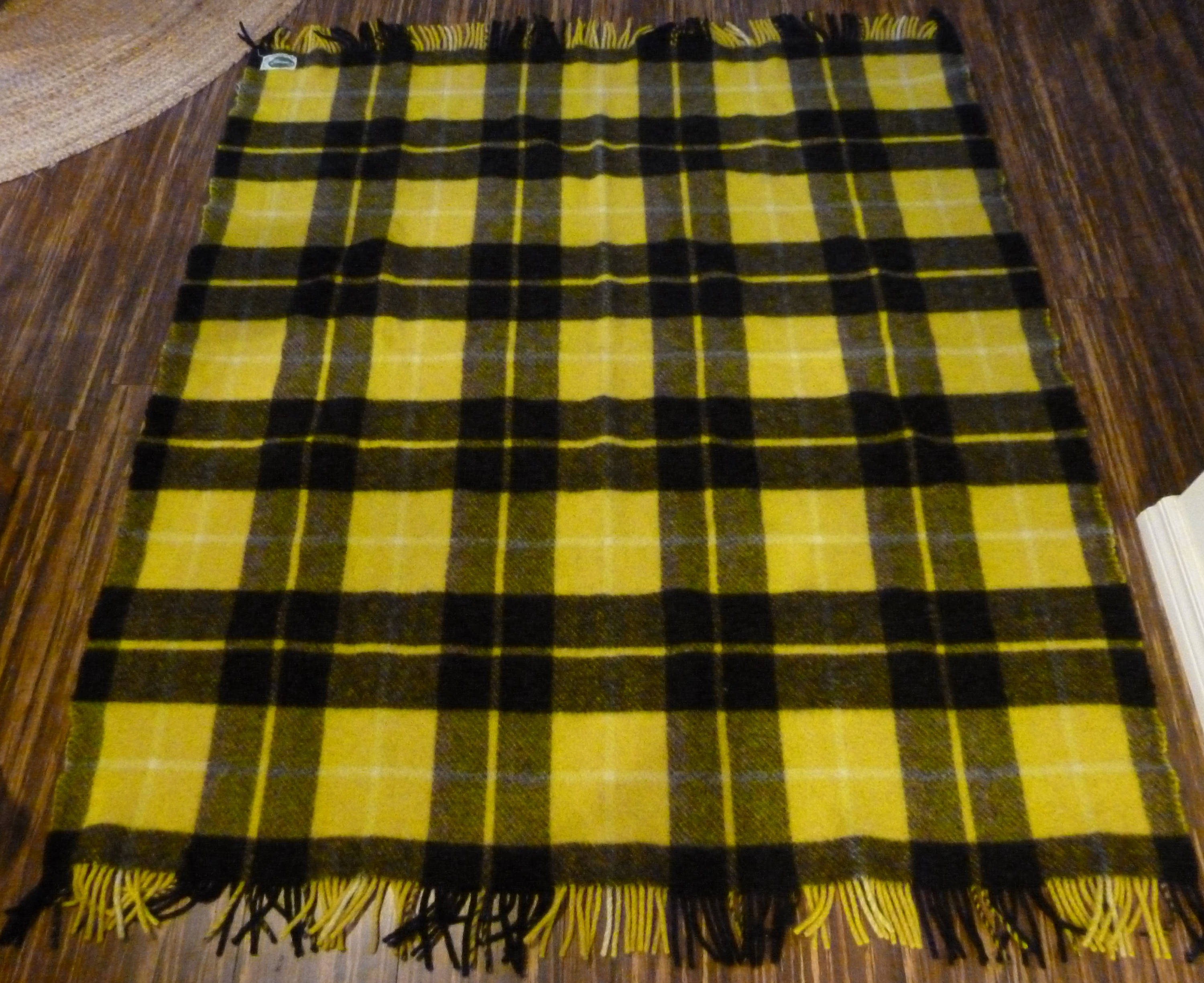 A Cozy Vintage Connemara rug/blanket/throw by Foxford Woolen Mills, Ireland in County Mayo. This blanket is in excellent vintage condition and features a plaid pattern in vibrant yellow and black. The perfect accassory for your Holiday Winter Decor or Outing.