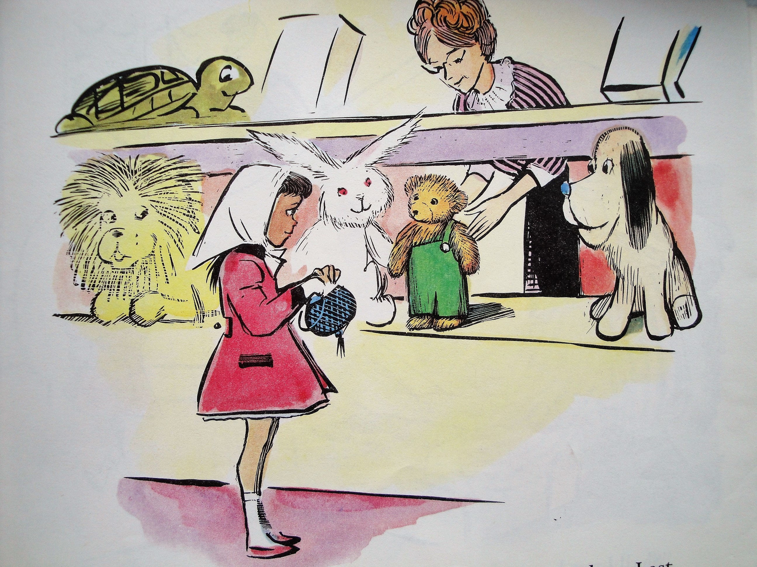 A sweet story about a bear who lives in the toy section of a department store where he is admired by a little girl in a pink coat who wants to be his friend. He goes on an adventure to find his lost button and a little girl comes back, uses her saved money to buy him, and takes him home to be her friend. The story is illustrated with gorgeous bright colors and contrasting black outlines, shadows, and crosshatching.