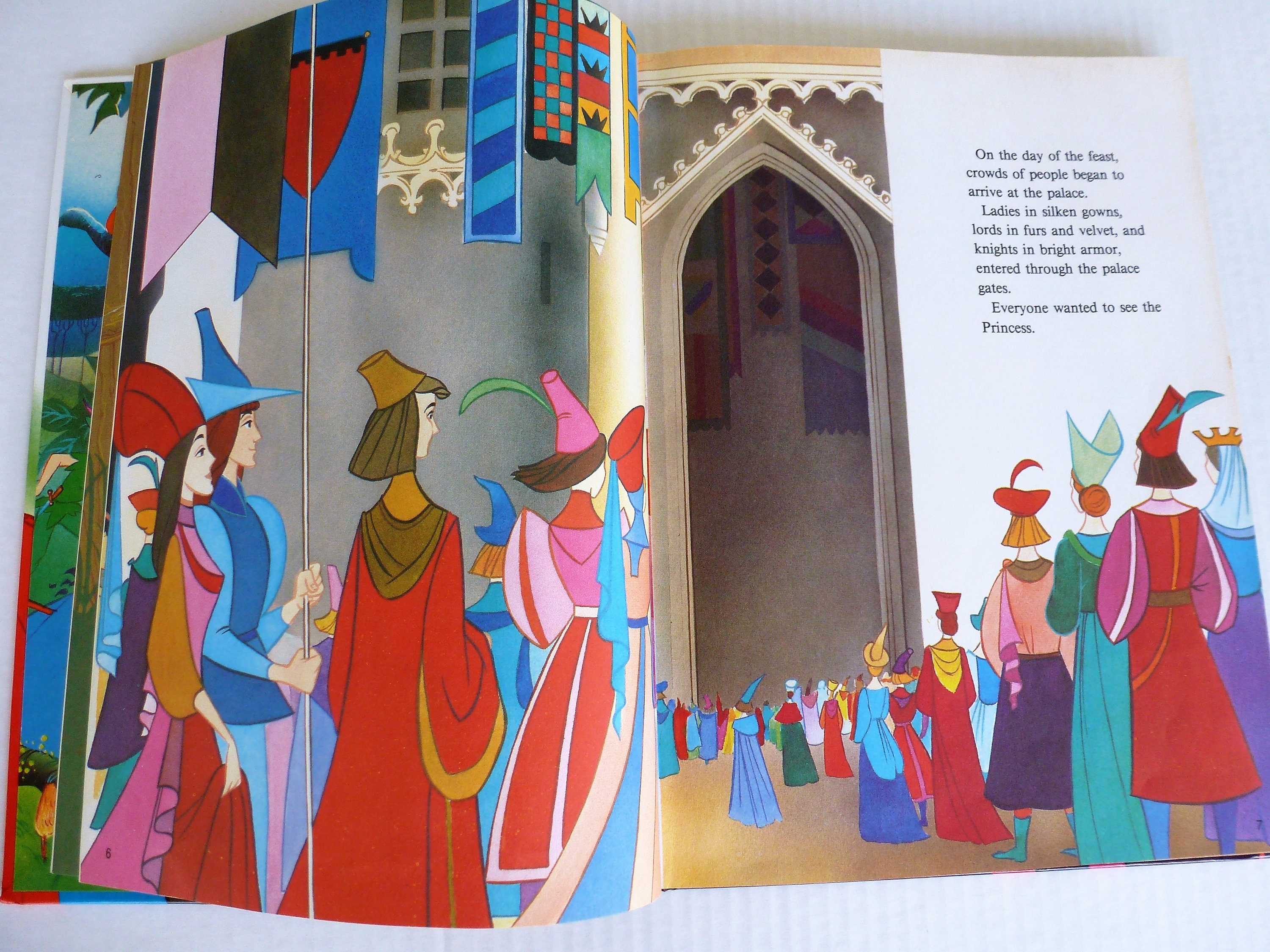 Beautifully illustrated vintage story of Sleeping Beauty, featuring Princess Aurora, Prince Phillip, Three Good Fairies, evil fairy Maleficent, and two kingdoms hoping to unite peacefully through a royal marriage.