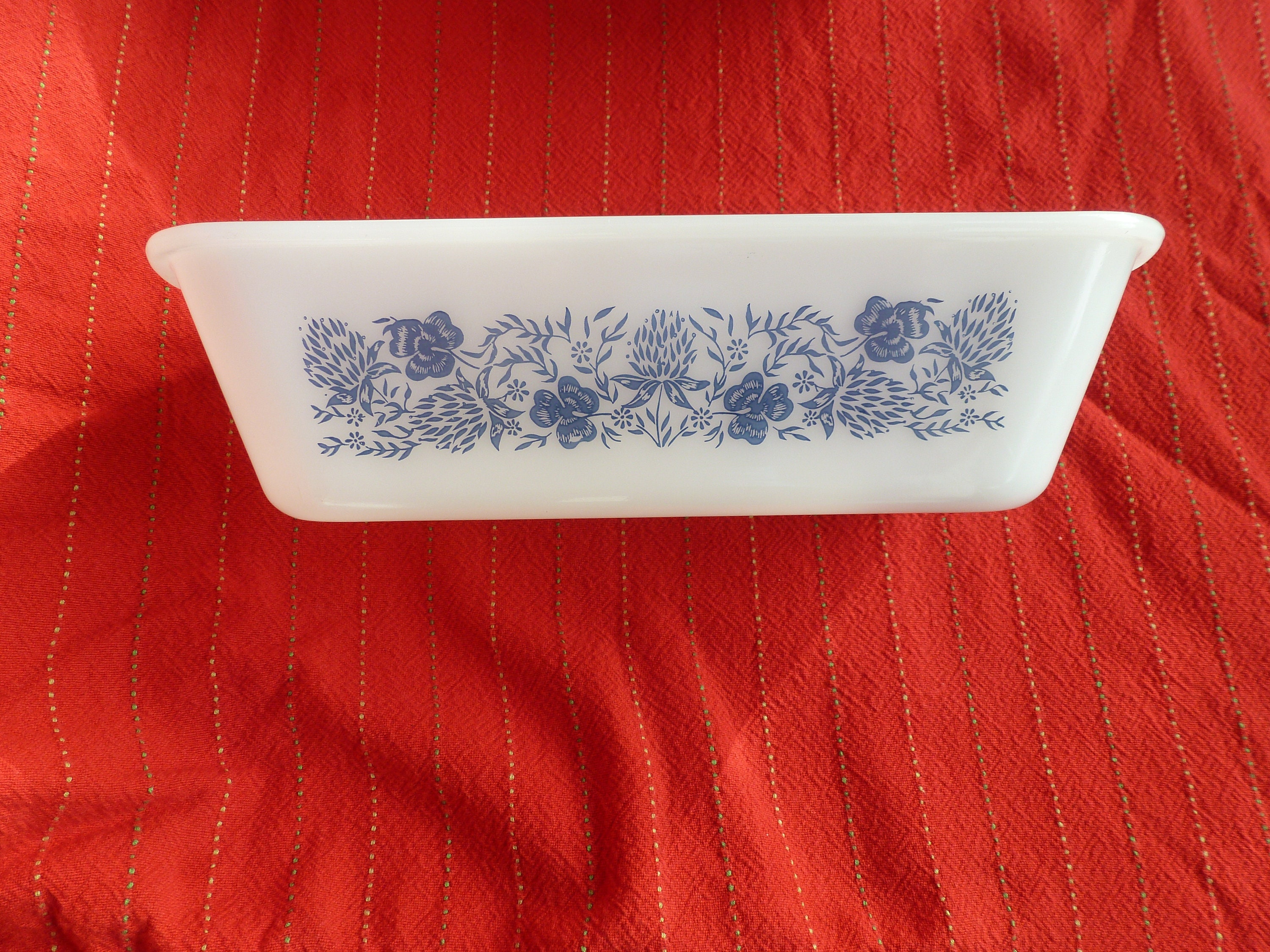 Condition of Blue Clovers/Blue Clover Leaves Dish: Excellent for age. A few small interior chips on inner lip on one side only. New Condition--never used--no food stains. Color is bright white. A few small horizontal marbling lines typical of milk glass on interior base. Printed on both long sides. No scratches on printing. Printed on bottom: Glasbake J522 1 1/2 QT U.S.