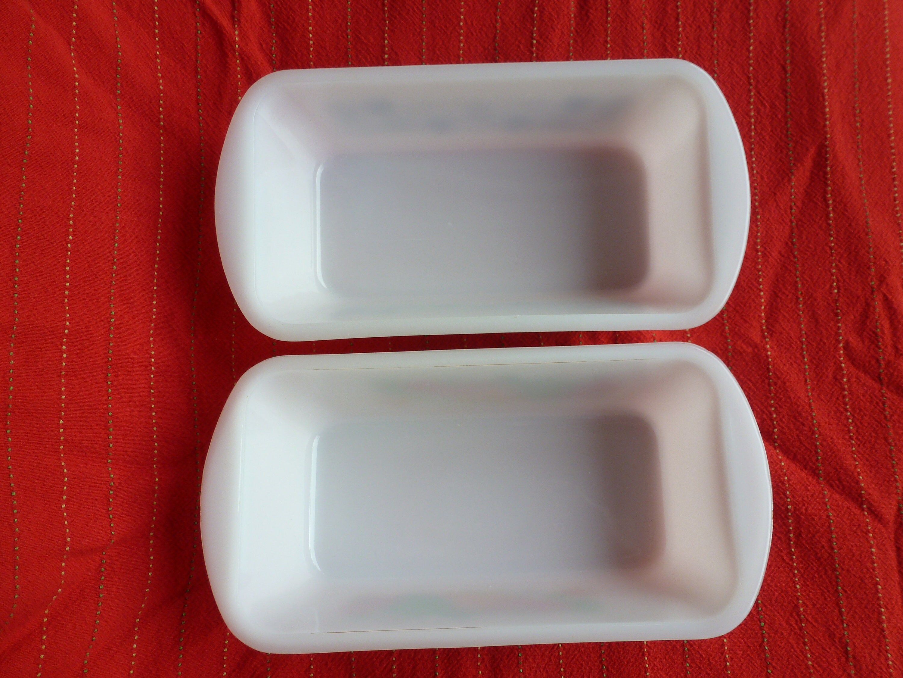Set of Two Cute Vintage Rectangular Casserole Dishes, in White Milk Glass with Printed Patterns.
